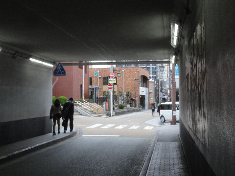 出てすぐ右折、線路沿いに道路は高架になっており横の細い道 |