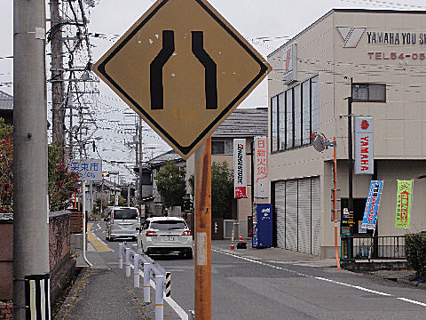 道は狭くなる歩道も黄色のペイントだけに。 |