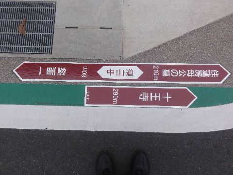 東海道との分岐、追分の道標京から来た東海道はここで右折して鈴鹿峠へと向かう、中山道は直進し彦根方向へと。 |