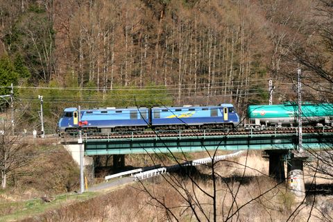 石油列車が来た塩浜と松本を結ぶ石油輸送、これは帰り便の空だが牽引はEH200。 |