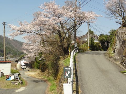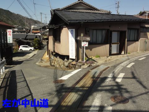 この先の細い道が中山道人の家の縁先を通るので左の坂を下るようガイドブックにあり、でも中山道の標識があるので直進する。 |