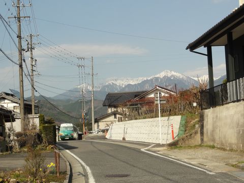 遠くに雪を被った山々アルプスの山々が見える。 |