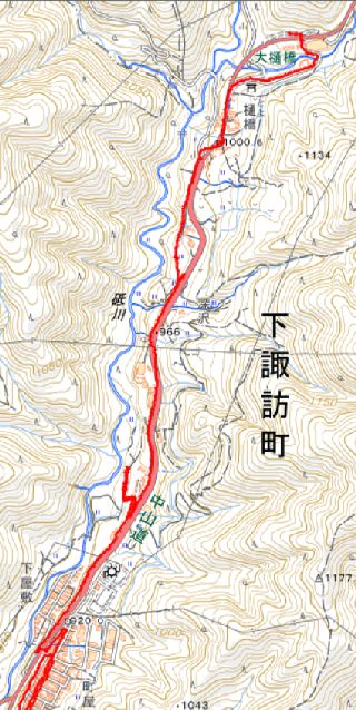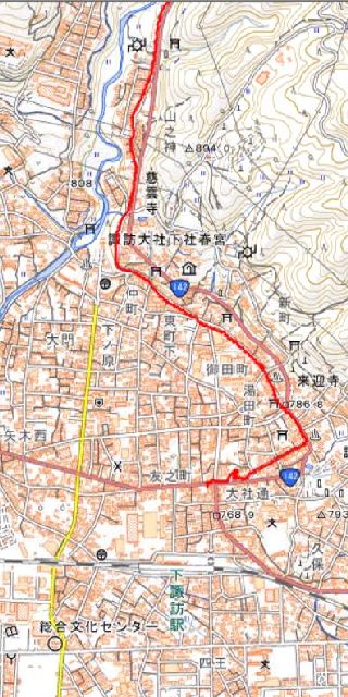 歩いたコース 下諏訪から水戸浪人塚9.03km/2時間40分/高低差290m