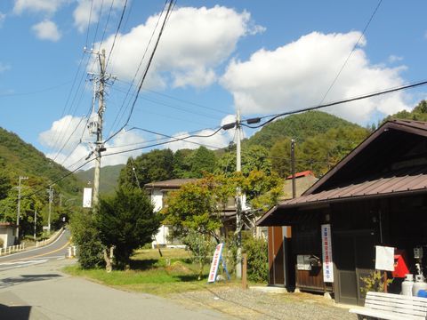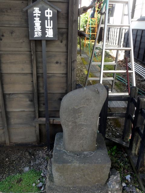 茶屋本陣の石碑江戸末期、ここを通った和宮の一行もここで休憩したそう。ちょうど峠を下ってきた人が昼食休憩中、朝一番のバスで男女倉口バス停まで行き、歩いてきたそう。 |