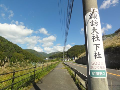 諏訪大社下社の看板「500m戻って左折」とある。 |