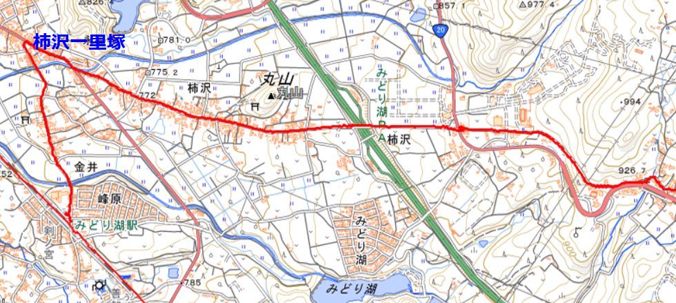 柿沢の一里塚Y字路の三角の部分にある、中山道は右へ直進。 |