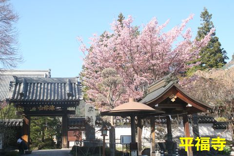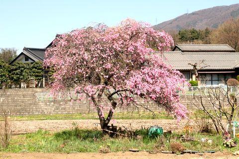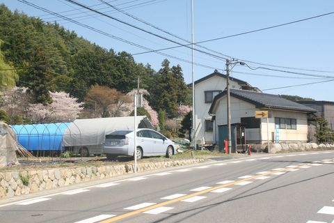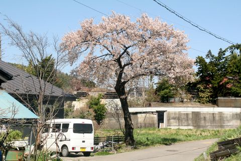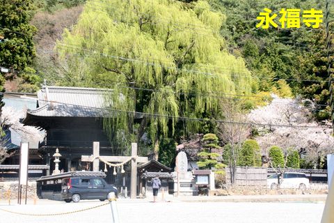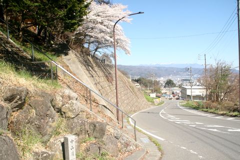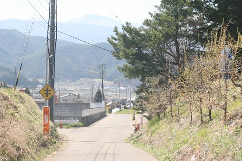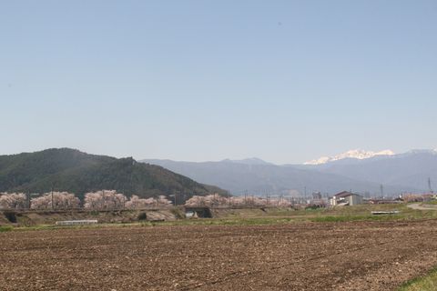 左手には線路添いの桜並木、その先は雪の山ここで列車が来ると最高の絶景だが、来ない。 |