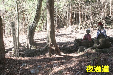 夜通道(よとうみち)江戸時代に諏訪藩の五千石の飛び地であった片丘の女性が夜諏訪の男のところを訪ねて通った道という逸話。 |
