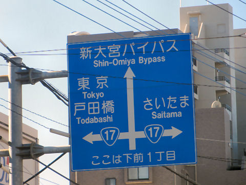 右手には17号の看板が見える広い道を越える際、右手にある看板、左は東京・戸田橋となっている。 |
