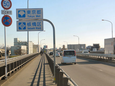 橋の中間で東京都へ荒川の中央で埼玉県・戸田市から東京都・板橋区へ変わる。 |