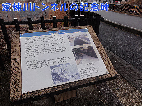 家棟川トンネルの跡の説明版天井川だった家棟川にあったトンネルは川底を下げて無くなった、前回通った時は工事完了のすぐあとで真新しい様子だった。 |