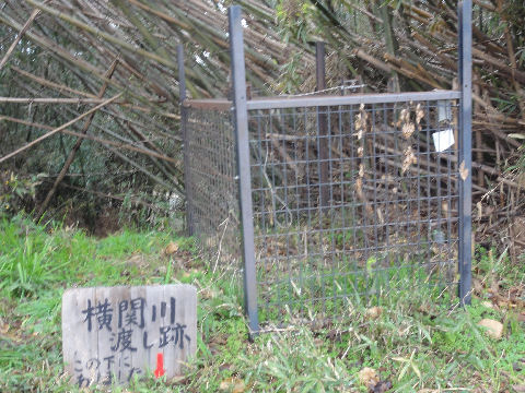 左手には渡し跡の看板すぐ脇には猪捕獲の罠? |