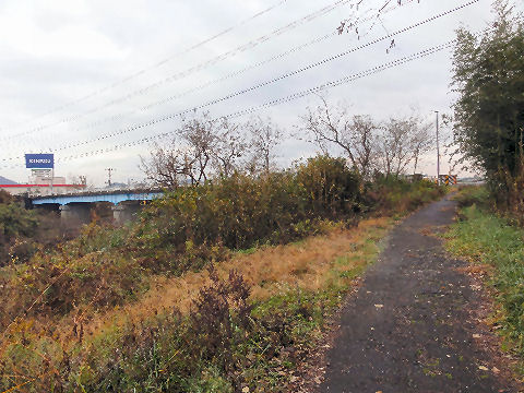 横関橋の古い親柱ここを左折し堤防上を北へ、川に沿って曲がって西方向へ。 |
