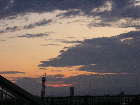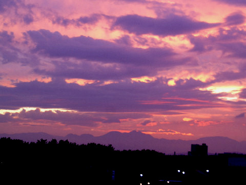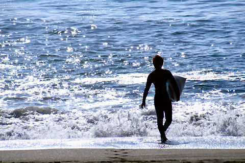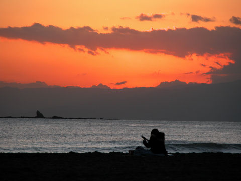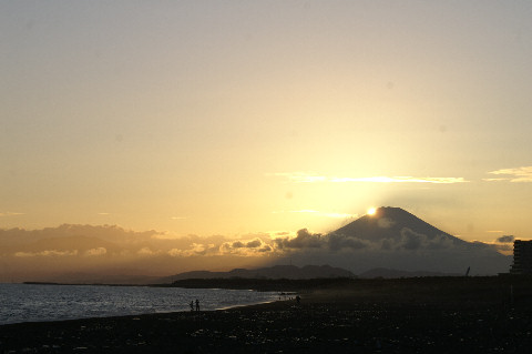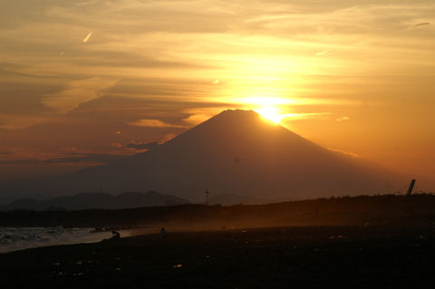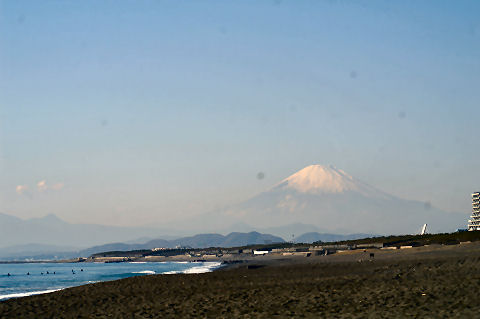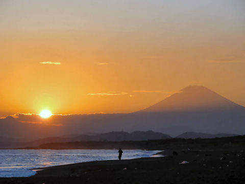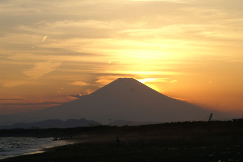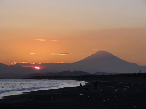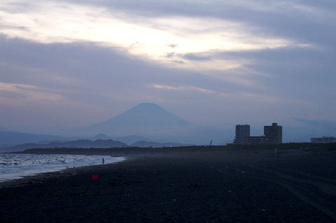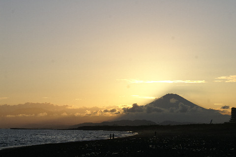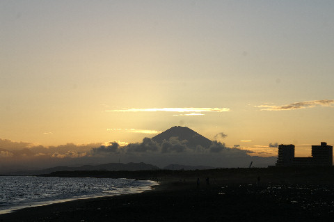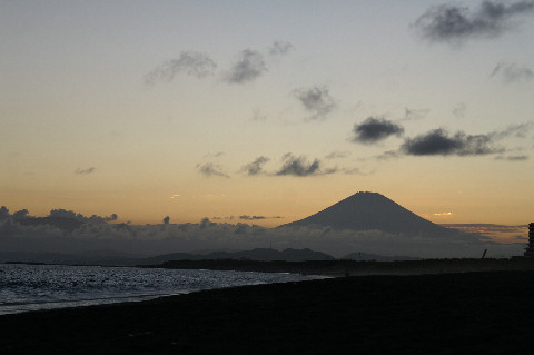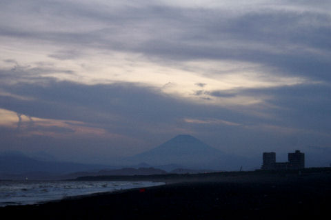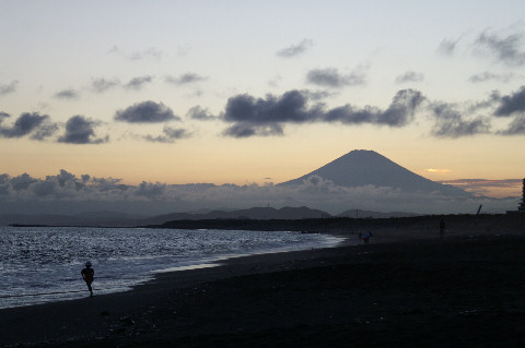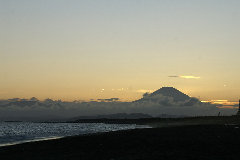 久しぶりの夕景を久しぶりに海岸へ、富士山は頂上が一部見えるのみだった。鵠沼海岸にはサーファーが多数、大した波もないので浮いているばかり。 |
