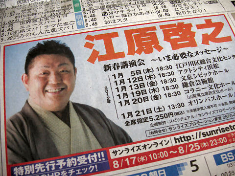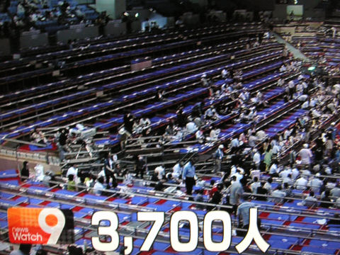 初日もがらがらで「大入満員」は出なかったが2日目は3700人(7000人以上入れる筈)という惨状、升席を減らすとか、自分たちの不始末の後始末として、料金を下げるとかの工夫が何も無い(その必要性も感じていない鈍感さ?)ので当然の結果とも。 |