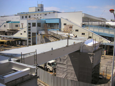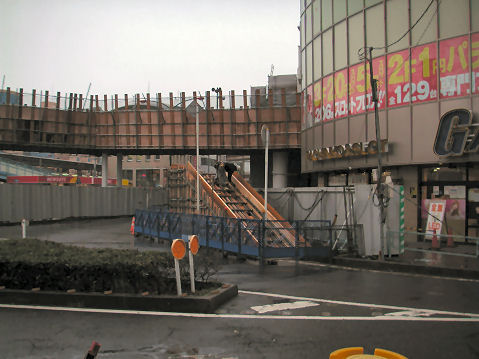 駅前のペデスタリアンデッキ工事進捗基礎ができたと思っていたら暫く見ないうちにもう橋げたが掛かっていた。道路を塞いでいた 囲いも縮小されてやや渋滞解消に。でも屋根が出来るのかは不明、屋根が無いと傘を差しての 通行で混雑になるか。 |
