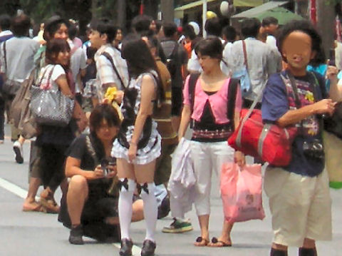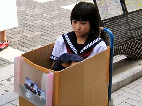 歩行者天国も復活して昔のほこ天に似たイベント?を発見、お尻丸出しの女の子をビデオ撮影する怪しいお兄さん、と段ボールはこに入れて台車に乗せて打ち捨てられたぴくりとも動かない女学生。これは一体何? |