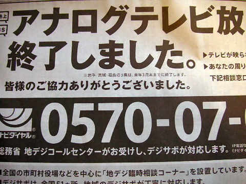 地アナ放送が終了ケーブルテレビの配信地区では2015年3月まではデジアナ変換でこれまで通りみられるようだが、お金を掛けるなら全世帯ケーブルテレビ化という選択肢もあったのでは、と思う。 |