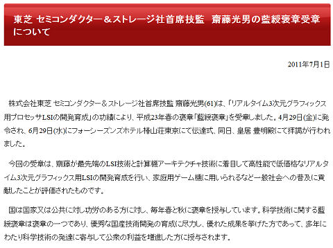こちらは良い話題教育で同期だった斉藤氏がCELL開発で藍綬褒章を受章したとの良いニュース。でも彼のキャラクターは勲章には馴染まない気もしないではないが。五月蠅いので祭り上げられた?という疑惑は無いのだろうけど。 |