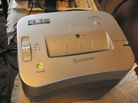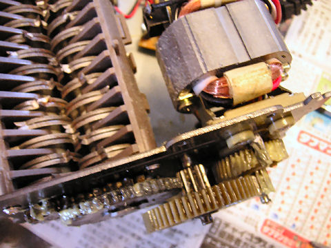 OHM電機のシュレッダ修理中国製だが急に間欠動作みたいになり、動かなくなった。分解するとモータは回っているがギアの歯が見事につるつるに飛んでいた。 よく観察すると金属製のギアが前段の同軸になっているナイロンギアにはまる構造なので、ギアを逆向きにしてたたき込み再組立。 これで暫くは使えるか。モータは整流子モータで火花がでながら回っている。 |