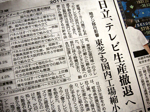 日立と三菱重工が統合へ協議開始今日のビッグニュース、日立と三菱重工がこれまでの協調関係を拡大し、社会インフラ事業で統合を協議とのニュース。 先の新日鉄と住金の統合に続く日本を代表する企業同士の統合、これでグループとして原子力ではBWRとPWRを両方保有して ビジネス拡大に繋げられるか?安心はできないけど。社会インフラ分野以外はどうする?下の記事、テレビ生産から撤退。 儲からない事業の代表になった嘗ての代表事業だったテレビ、いまやお荷物事業の代表選手に、黒字なのは東芝だけとか。 |
