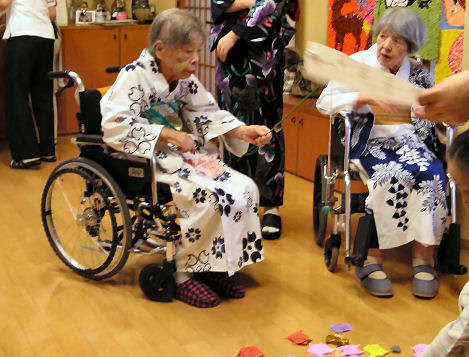 特養に到着して直ぐに介護タクシーが到着、車椅子のまま入所へ。3階のユニットだが4月にできたばかりで新しく気持ちよい、スタッフも若い人が多い。 |