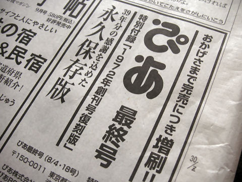 雑誌ぴあが休刊、39年続いたが70年代の名画座めぐりでは随分とお世話になった「ぴあ」、映画を余り見なくなってからは ご無沙汰だったが、時代の変化で遂に休刊(廃刊と何故か言わない、鳥の死を落鳥というのと 同じ?)。インタネットには勝てないからか? |