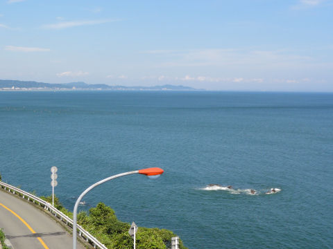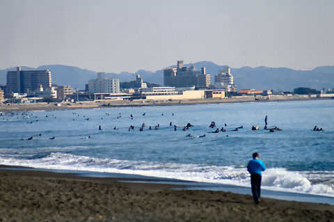 大して波もないのに鵠沼を中心にサーファー多数。 |