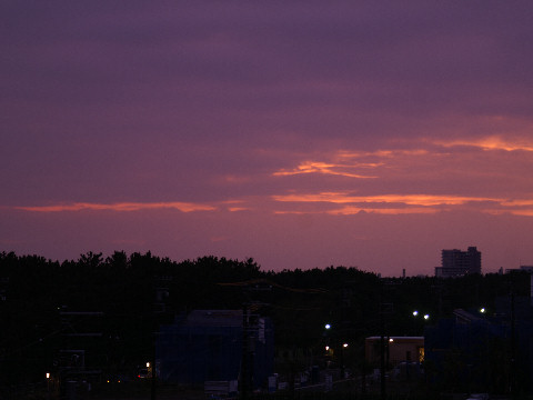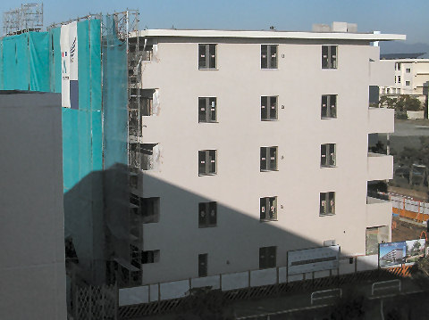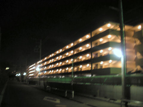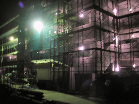 隣のマンション工事は内装が主体で追い込み中、夜も結構遅くまで工事をしているようで明かりが見える。北側廊下の明かりが点いて人が住んでいるようにも見える、下はまだごちゃごちゃで工事続行中。 |