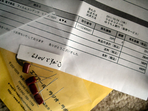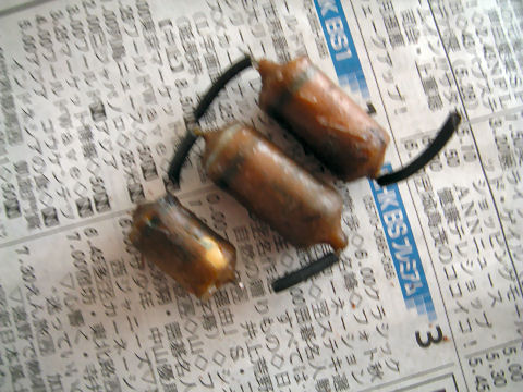 上は秋月で買ったスーパーキャパシタ2個、部品は安いがチューナを分解sて交換するのは結構大変そう。(年内に出来るのか,大いに心配) |