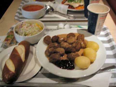 平日なのでそれほど混んではいなかったがレストランは結構な混みよう、スウェーデン料理である肉団子15個のランチ。新横浜からのシャトルバスに中にはぬいぐるみの飾り付け、店頭ではアメリカと同じようなもみの木の販売、自分で選んで包装して購入するスタイル。 |