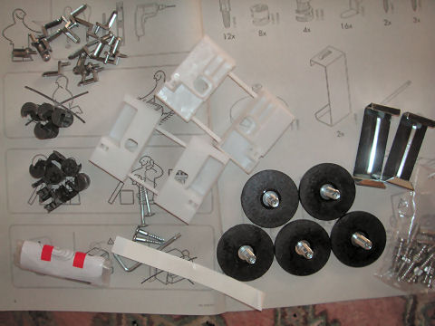イケアの家具が届き、組み立て今回はローボードのようなものなので組み立ての取り回しは容易であったが、それでも汗をかいた。最初にネジなどの付属品を確認、説明書に従って組立て開始。基本は前回と同じなので簡単。今回は扉をレールによる支持としたがレールの両端のストッパの取り付けに力が必要で汗をかいた、またアンプ等の設置を考慮して中央上部にケーブル穴を作ったが棚板が奥の板まで届いており、このままでは調子が悪い。 |