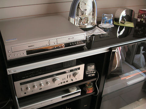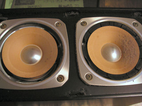 まずは完了HDDレコーダ、アンプ、チューナとスピーカを設置。元々のスピーカは音が変だと思っていたらエッジが見事に無くなってしまっていた。薄いプラスチックだったようでボロボロになって朽ちてしまったよう。スピーカとドロンコーン共に駄目に、ウレタンなので寿命10年だそう、完全にこれ以上経過しているので完全に消滅状態。 |