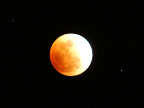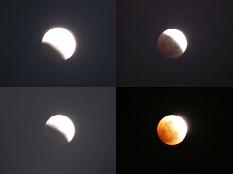 皆既月食は午後11時5分すぎから、それまで段々と欠けてゆく。初めは月が明るく影の部分は見えないが、欠けてくると影の部分もはっきり見えるようになってくる。 |