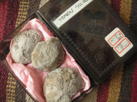 最上段は89年のイエメン(当時はまだ北イエメン)へプラント電気品の現地調整に行ってくれた調整員の人からお土産にもらったウニの化石、現在は標高2000m以上の土地だが元は海底だった証拠。 |