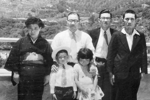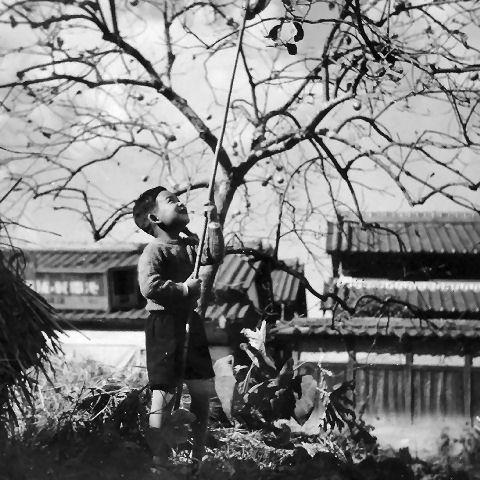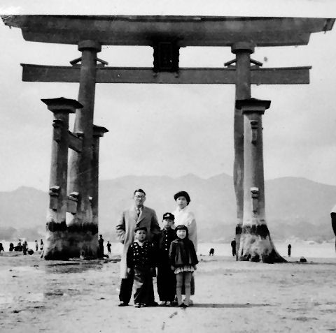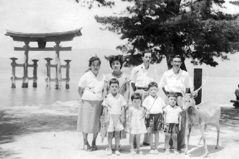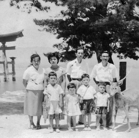 宮島で最上段はお祖父さんの家の裏にあった(まだある?)柿の木の柿を取ろうとしている様子、2つ目と3つ目は共に広島の宮島で撮影されたもの、奈良で親しくしていた(弟はよく2回目の朝ご飯を食べていた)国鉄勤務のご家族が訪ねてきた時(多分1955年)とその後に大阪の叔父さんが訪ねて来た際の撮影だろう。 |