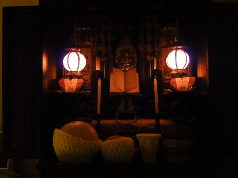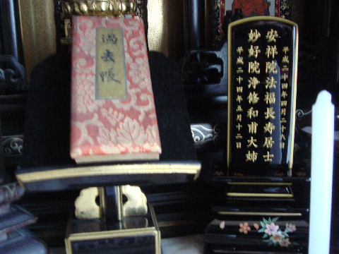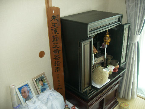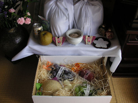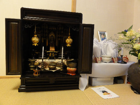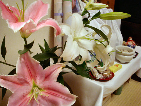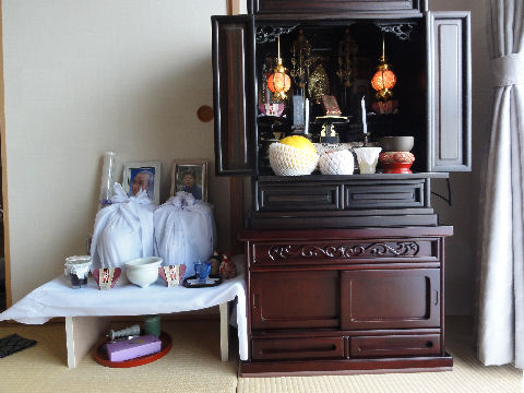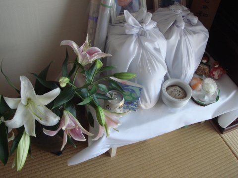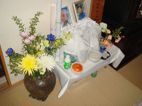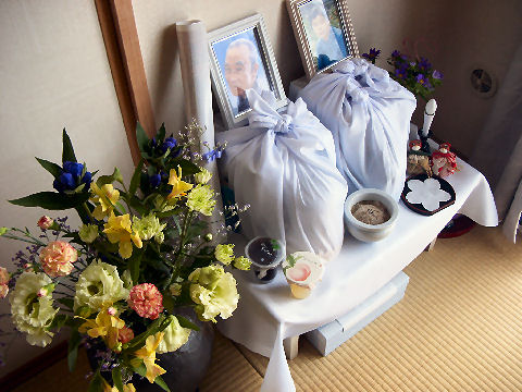 香典返しも終えて早いもので父が亡くなってから2ヶ月半近く、母が亡くなってから2ヶ月近くになった。先月末デパートから発送した香典返しも全部無事に到着したようで、あとは預金と不動産の相続とそれに関連する手続きを残すだけとなった。下の階の方からお花を頂いたので早速父と母の仮祭壇に。 |