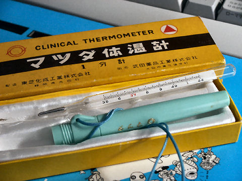 上は見付けた昔の水銀体温計、マツダブランド、武田薬品が販売。 |