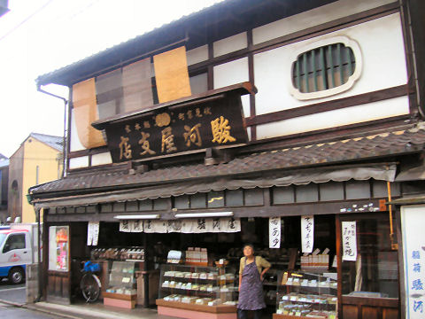 JR奈良線の「稲荷駅」が最寄りだが快速通過駅で不便、駅前の古いお菓子屋さん、気になったが雨で冷やかすのを断念。 |