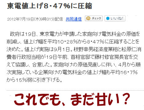 東電の値上げ決着疑問・議論噴出で時間が掛かったが民主党政府が一応の結論を出した。東京電力は何時ものように自分達の言う通り通ると勝手に思っていたようだが、そうは行かず。倒産して国から資金を注入される会社なのに賃金も大して下げず、福利厚生のレベルも平均以上を維持するなど勝手放題で通ると思っていたのだろうか? |