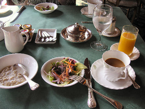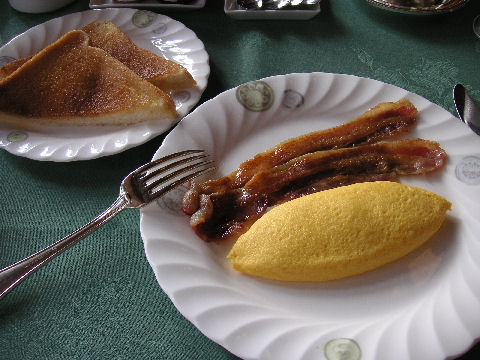朝は含まれていた朝食から洋食を選択、他には和食・粥があったが。久しぶりのフルセットの洋食での朝食、これで2200円也。 |