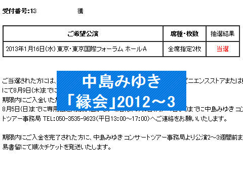 中島みゆき・縁会2013に当選会員先行申し込みで当選、来年1月16日とは大分先だが振り込みは8月6日までと異様に早い、普通の事業なら商品引き渡し前の全額入金なんて夢のまた夢なのに。 |