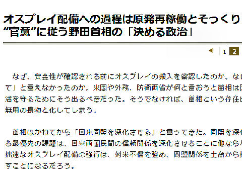 またも素人が安全宣言?オスプレイの安全検討、どうも原発の安全宣言と同じ展開になりそう、どちらも真の原因は曖昧にしたまま門外漢の素人が勝手に「安全を確認した」と少しも説得力の無い宣言で強引な幕引きをして猛反発をかったばかりなのに。 |