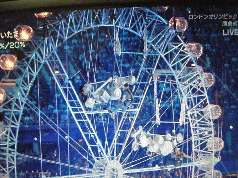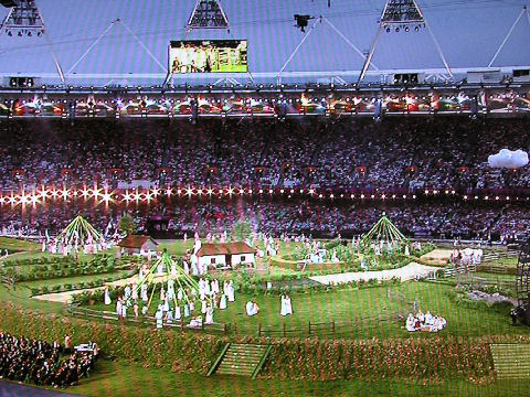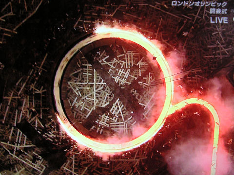 意表を突く演出?英国の歴史、欧州の辺境の田舎からの出発を見せた演出、優雅さは無いが力強い国民と言いたい?007や女王も演出に協力、見世物度が強くなり過ぎてしまった印象も残る。ベッカムは結局は聖火運搬船の付き添いだった、最終の着火ランナーは7人。 |