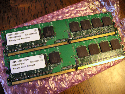 オークションで買ったメモリ(2本で1GB)が届いた、2GB増設も考えたが32BITのOSでは1GB近く無駄になるようで諦めた、500円+送料。 |