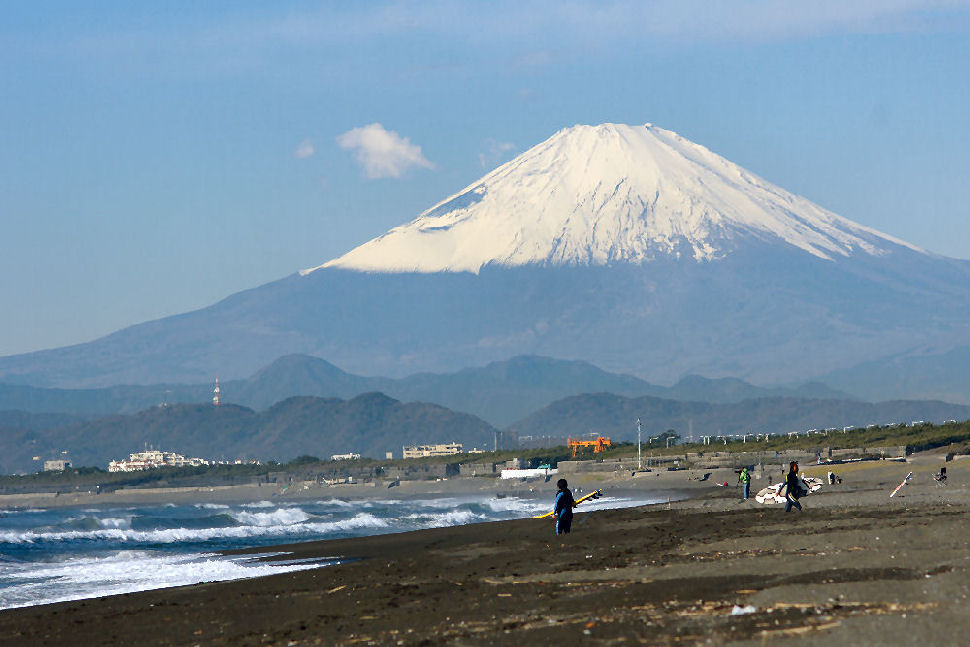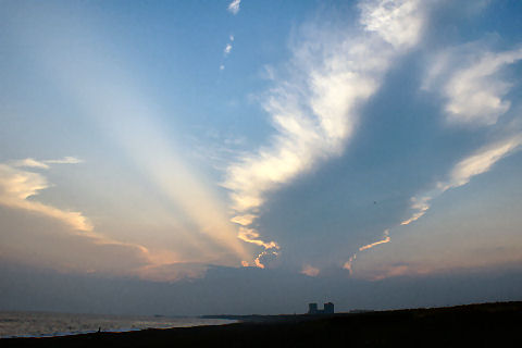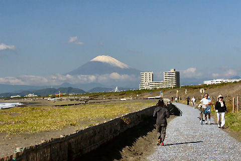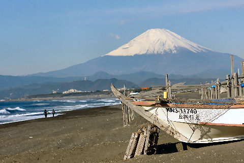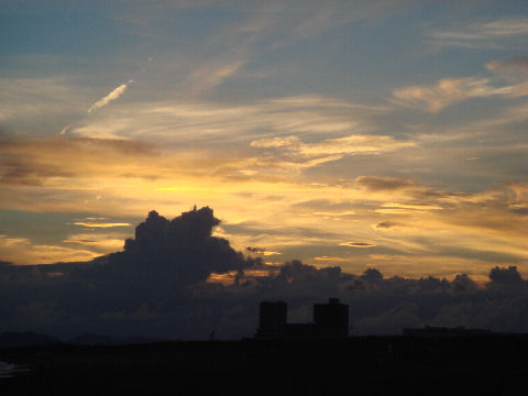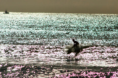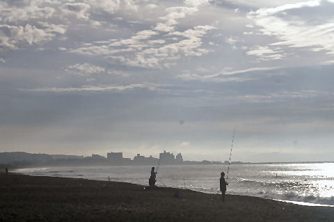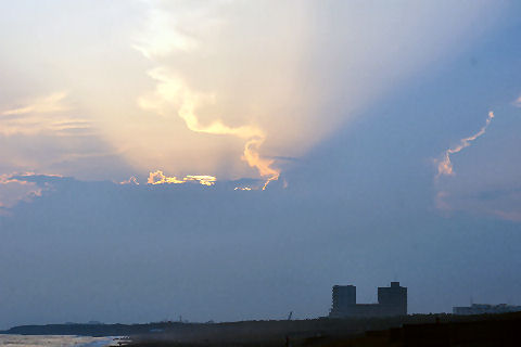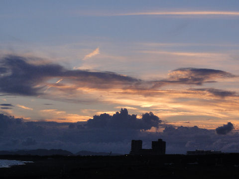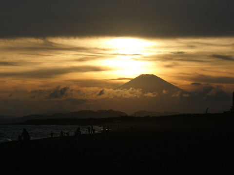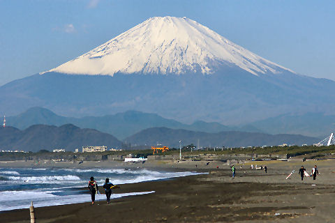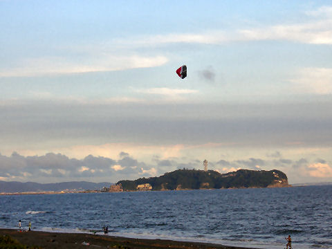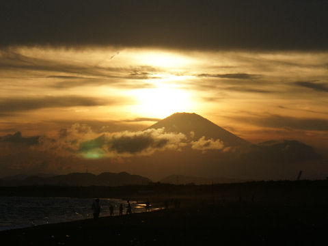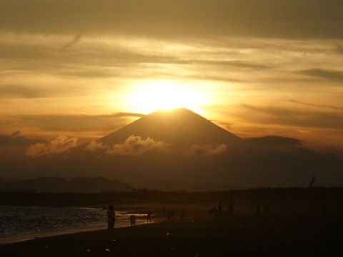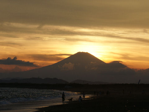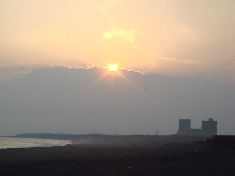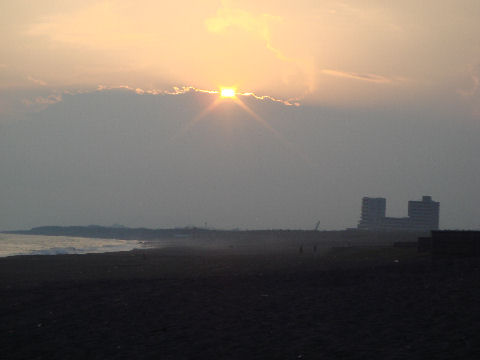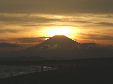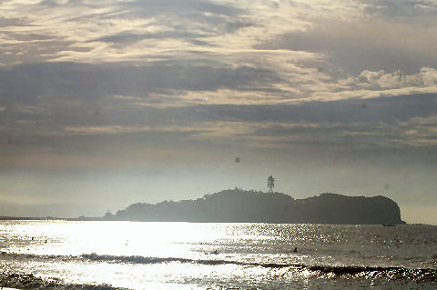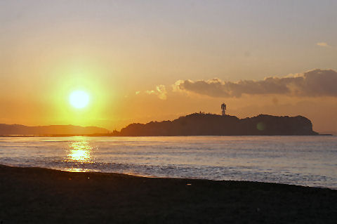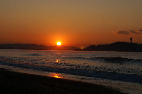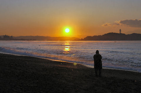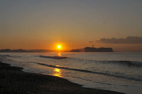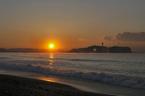 江ノ島の夜明け朝、早起きして海岸から日の出の撮影に出かけた。実際の日の出は意外に遅くて7時過ぎで海岸で寒いなか随分待つ事になった。それでも何人か日の出を見に来ている人もいて、朝早くからのサーファーも居た。 |