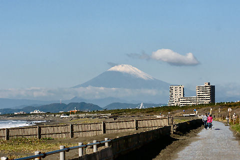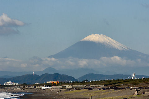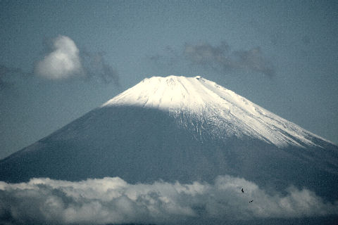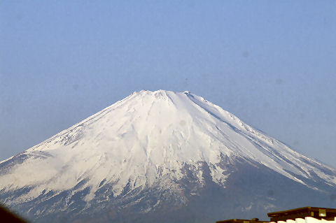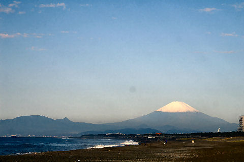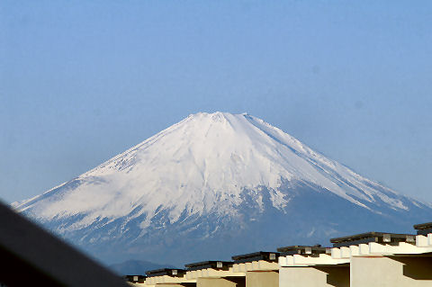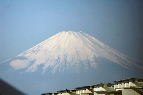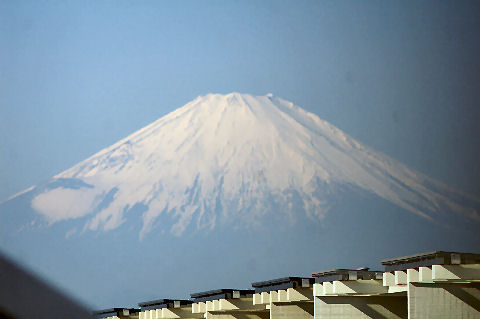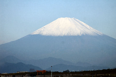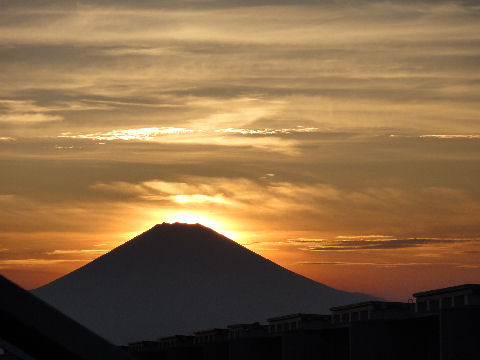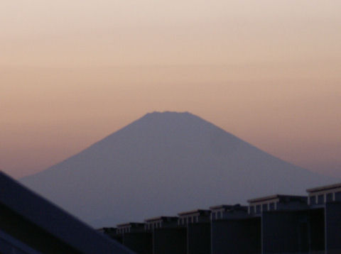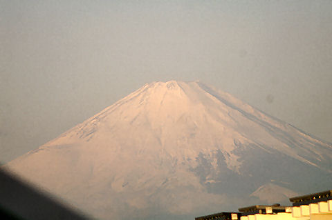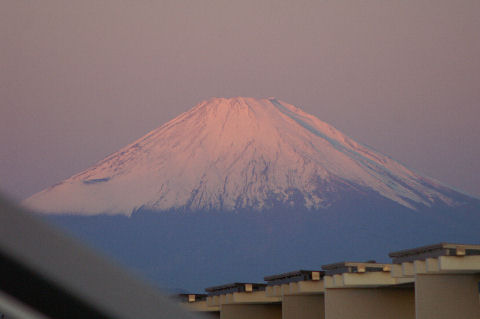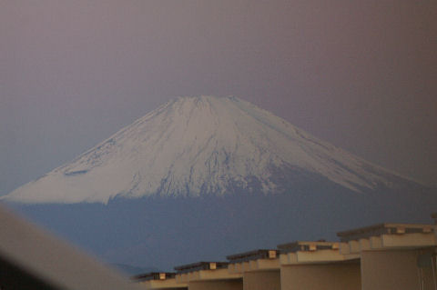 鎌倉方向は丘があり海からの日の出は到底望めないが低い丘から登ってくる朝日を見る事ができる。後ろ側になる富士山は薄い朝の光をうけてボォーとして見えるが下まで雪で真っ白になっている。 |