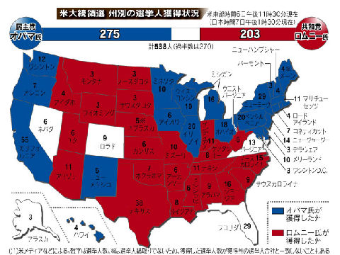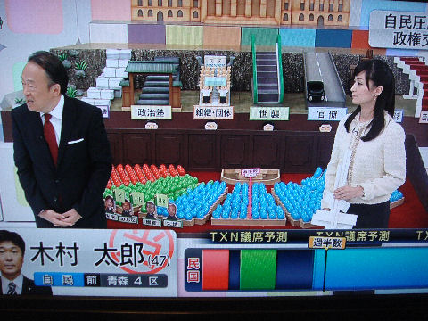 テレビでは早くから自民党の圧勝報道午後8時に投票締め切りになった直後から「自民圧勝で過半数越え」との報道が続出、民主党の5−60議席という報道も共通。こんな明らかな結果も見通せず選挙へ舵を切った民主党の甘さが国民を大きく裏切ることになった、現職大臣は軒並み小選挙区では落選、あのパフォーマンスで悪評のオバサンも見事落選。 |