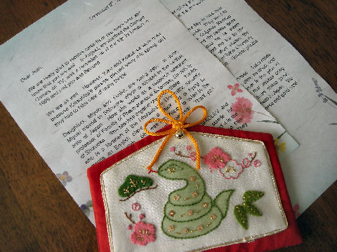 クリスマスのメールを英国へ英国の知り合いのお年寄りへのクリスマスのメール。文章は長女が担当、オーナメントは妻の作、和紙に印刷して娘たちの写真数枚を同封して送る予定。 |
