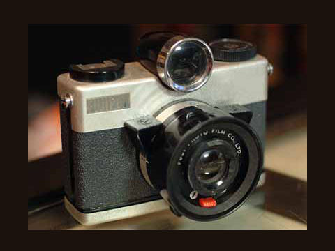 昭和34年に買ってもらった子供用カメラ、フィルムはブローニーで12枚撮り。固定焦点でシャッター速度固定、絞りは「晴れ・曇り・雨?」だかの選択のみのシンプルカメラだがよく売れたよう。後に普通のフィルムを使うタイプもあったらしい。 |
